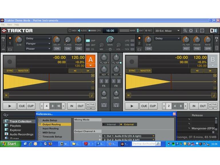 Wenn Sie das Audio-8-DJ-Interface einsetzen, haben Sie die Möglichkeit, alle vier Decks auf einem eigenen Ausgang auszugeben. Das Mixing findet dann sinnvoll mit einem externen Vierkanalmixer statt. Durch diesen Schritt können Sie wiederum Bildschirmplatz einsparen und die Bedienelemente des Softwaremixers ausblenden. Aktivieren Sie dazu den External-Mixermodus in den Preferences unter dem Punkt Output Routing.