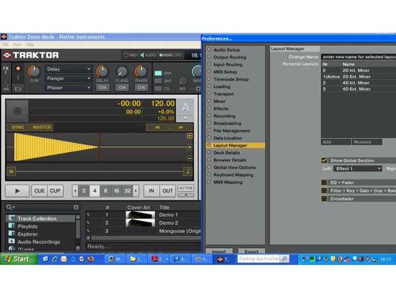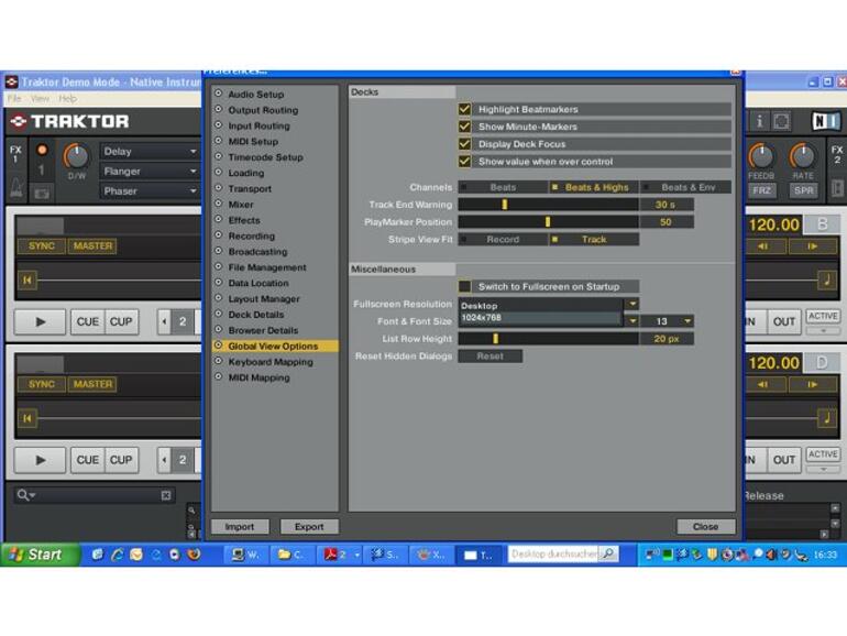 Sie können Traktor im Vollbildschirmmodus ausführen, um die Anzeigemöglichkeiten des Programms zu maximieren. Zusätzlich können Sie die Bildschirmauflösung abweichend von der aktuell gewählten selektieren. Rufen Sie dazu den Unterpunkt Global View Options auf und treffen Sie eine entsprechende Auswahl unter dem Punkt Fullscreen Resolution. In diesem Fall werden Ihnen 1024 x 768 Bildpunkte als Alternative angeboten.