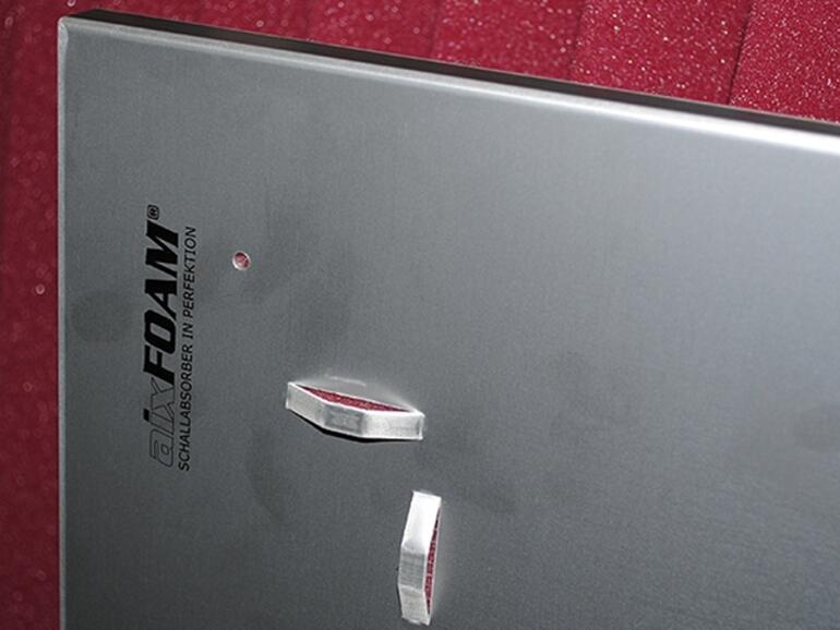 Für die Montage der Deckensegel gönnen wir uns etwas Luxus und entscheiden uns für die aixfoam-Hängekassetten, die aus eloxiertem Aluminium gefertigt werden und die Möglichkeit bieten, den Absorber hochkant, quer oder von der Decke schwebend zu montieren und natürlich auch jederzeit zu demontieren.