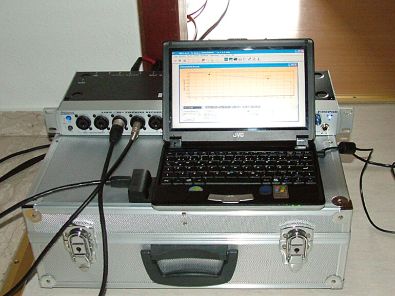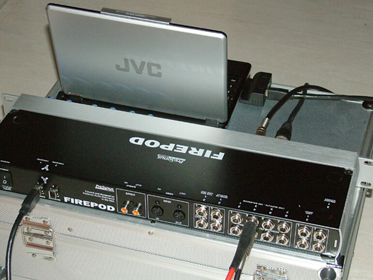 Im Beispiel läuft HBX.6 auf einem kompakten Notebook, das via FireWire mit dem Mic-Preamp (Presonus Firepod) verbunden ist. Kanal 3 nimmt das Mikrofonsignal auf, Kanal 4 dient als Signalreferenz. Alternativ kann auch eine preiswerte PCI-Soundkarte mit Preamp, beispielsweise ESIs Maya 44 oder M-Audios Delta 1010LT oder auch eines der zahlreichen USB-Interfaces verwendet werden.