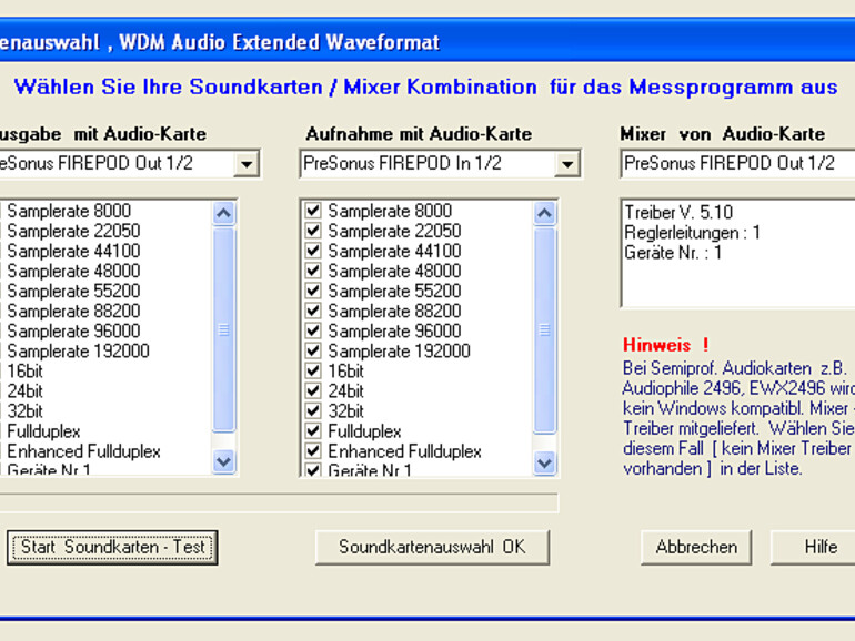 HBX.6 arbeitet mit vielen ASIO- oder WDM-fähigen Karten zusammen. Bei Programmstart erkennt die Software automatisch alle installierten Treiber und fordert den Anwender auf, die gewünschten Anschlüsse und unterstützten Samplingraten auszuwählen. Da Windows gerne ein Resampling durchführt, sollten hier nur Wortbreiten und Samplingraten angewählt werden, die von der Hardware real unterstützt werden.