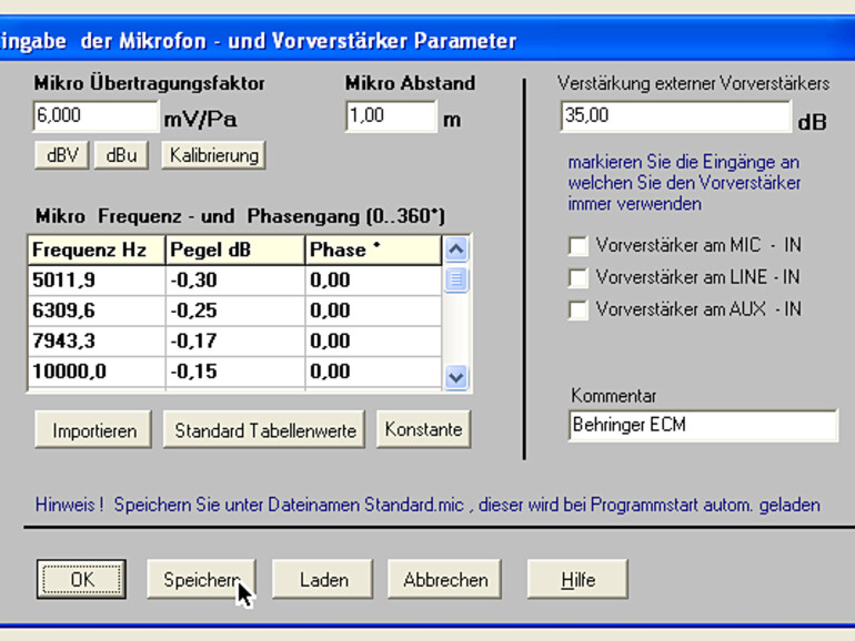 Als Messmikrofon verwenden wir im Beispiel Behringers ECM8000, das zum Straßenpreis von 59 Euro erhältlich ist. Alternativ kann auch jedes andere Kondensatormikrofon mit Kugelcharakteristik eingesetzt werden. Für das ECM8000 sind allerdings für den Heimgebrauch recht nützliche Kalibrationsdateien im Internet zu finden, mit denen sich der Frequenzgang des Mikros grob anpassen lässt.