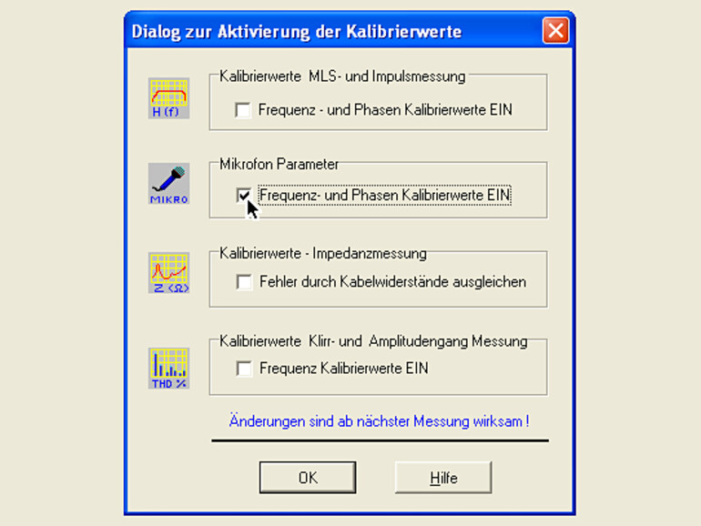 Damit die eingestellten Korrekturen auch wirksam werden, dürfen Sie nicht vergessen, die Kalibration der Mikrofon-Parameter einzuschalten. Dies erreichen Sie durch Drücken von [F5] oder über den Menüpunkt „Kalibration an/aus“. Achtung: HBX.6 kann nachträglich keine Korrekturen aus den Messungen entfernen oder einrechnen. Benutzen Sie diese Tabelle also, bevor Sie eine Messung starten.