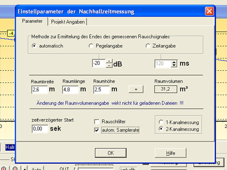 Zur korrekten Ermittlung von Hallradius und des Bassverhältnis benötigt HBX.6 noch die Angabe der Raummaße. Hierbei kommt es weniger auf die Abmessungen der einzelnen Wände als vielmehr auf das Raumvolumen an. Daher können Sie sich auch mit der 3. Wurzel aus dem Volumen behelfen, falls die Einzelmaße nicht bekannt sind. Die Werte geben Sie im Dialog „Einstellparameter“ unter „Einstellungen“ an.