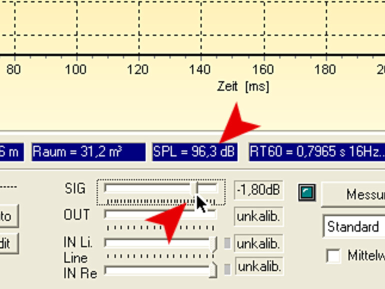 Die Nachhallzeit ist als die Zeitspanne definiert, in der das Erregersignal (meist MLS-Rauschen) nach dem Abschalten um -60 dB abgefallen ist. Damit das gemessene Signal nicht in den Umgebungsgeräuschen oder dem Preamp-Rauschen untergeht, muss der Raum mit mindestens 94 dB SPL angeregt werden. Erhöhen Sie dazu solange den Signalausgang, bis HBX.6 nach einer Testmessung einen entsprechenden Pegel anzeigt.