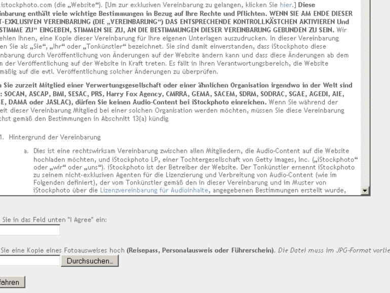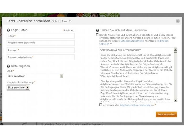 Die Anmeldung bei iStockaudio ist kostenlos. Klicken Sie dazu auf Registrieren in der oberen rechten Ecke der Webseite. Im Formular tragen Sie Ihre Mailadresse, einen optionalen Mitgliedsnamen und ein Passwort ein. Wählen Sie weiterhin Ihr Heimatland und die hauptsächliche Nutzung. Jetzt müssen Sie nur noch der Mitgliedschaftsvereinbarung zustimmen, und die erste kleine Hürde ist gemeistert.