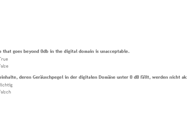 Das Portal ist mehrsprachig. Dies erweist sich beim Bestehen des Tests als hinderlich, denn Frage 7 ist falsch übersetzt. Audiodaten, deren Pegel über 0 dB liegt, werden von iStockaudio abgelehnt, Frage 7 ist also mit Richtig zu beantworten. Der Einfachheit halber empfiehlt es sich, das Quiz von Beginn an auf Englisch zu machen. Die restlichen Fragen lassen sich recht einfach beantworten.