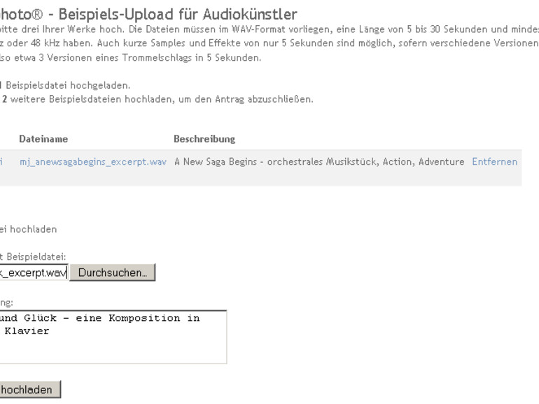 In den abschließenden Schritten reichen Sie nun drei Beispiele Ihrer Musik zur Prüfung ein. Die WAV-Dateien sollten eine Auflösung von 16 Bit und eine Abtastrate von 44,1 kHz oder 48 kHz besitzen. Die Länge sollte zwischen fünf und 30 Sekunden betragen. Nutzen Sie das Eingabefeld, um den musikalischen Inhalt ihrer Tracks zu beschreiben.