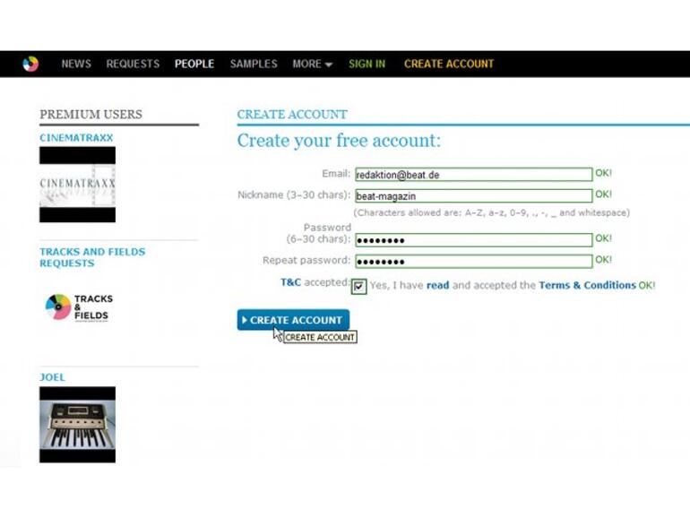 Der Basiszugang zu Tracks and Fields (im folgenden T&F) ist kostenlos. Um einen Account anzulegen, wählen Sie auf der Webseite die Funktion Create Account. Bei der Registrierung müssen Sie nur Ihren gewünschten Künstlernamen, Ihre E-Mail-Adresse sowie ein Passwort angeben. Kurz darauf erhalten Sie eine Bestätigungs-Mail mit einem Link zur Aktivierung Ihres Accounts.