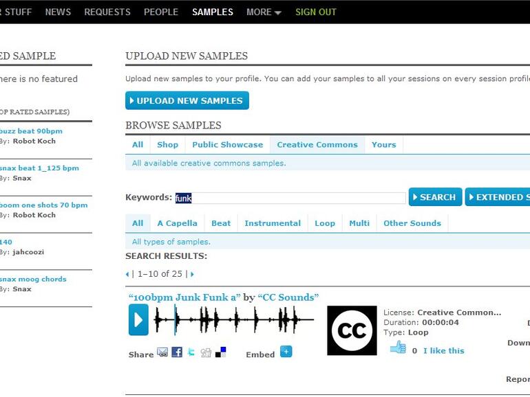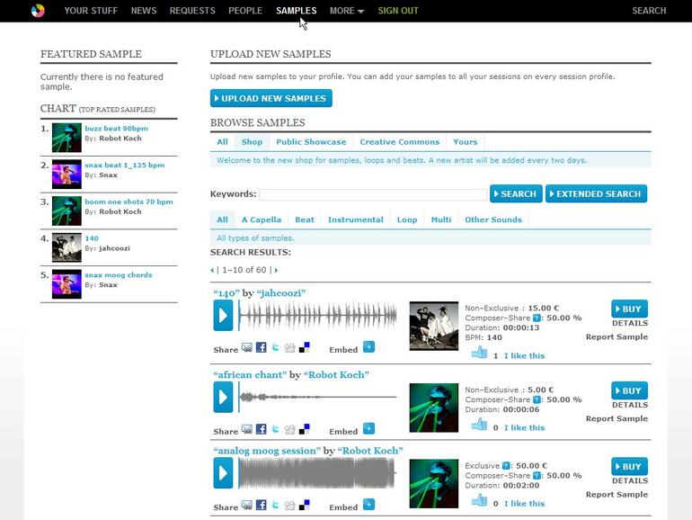 Auf der Sample-Seite finden Sie eine Suchfunktion für Audiodateien, wobei Sie definieren können, ob Sie kostenpflichtige oder frei nutzbare Samples suchen. Dabei können Sie auch nach bestimmten Attributen wie verwendeten Instrumenten oder Stimmungen suchen. Natürlich können Sie auch eigene Samples und Loops hochladen und zum freien Download anbieten.