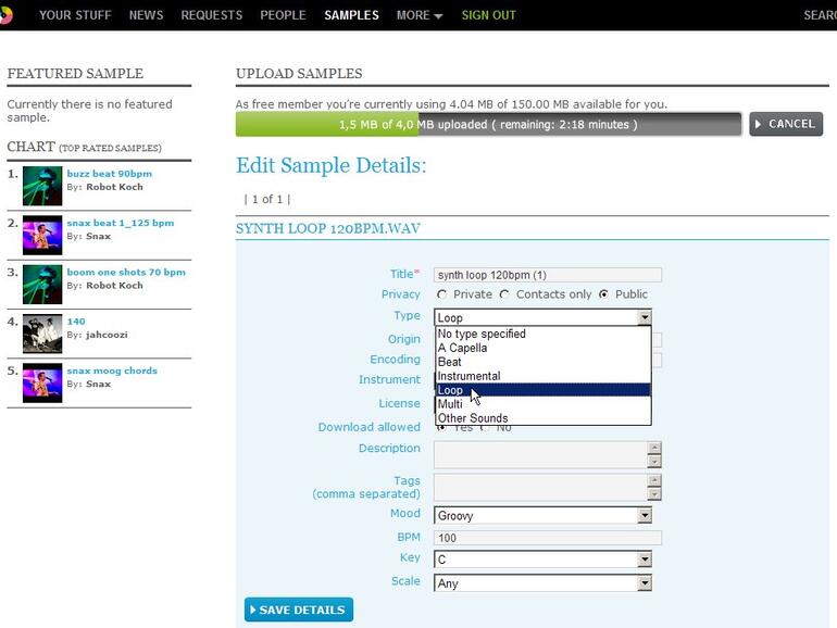 Klicken Sie auf Upload Samples und im Anschluss auf Select Samples, um eine Audiodatei hochzuladen. Wählen Sie nun die gewünschte Datei auf Ihrer Festplatte aus. Im folgenden Dialog können Sie Informationen zu dem Sample eintragen und bestimmen, welchem Benutzerkreis es zugänglich sein soll. Ihre Samples erreichen Sie jederzeit über Ihr Your Stuff-Menü.