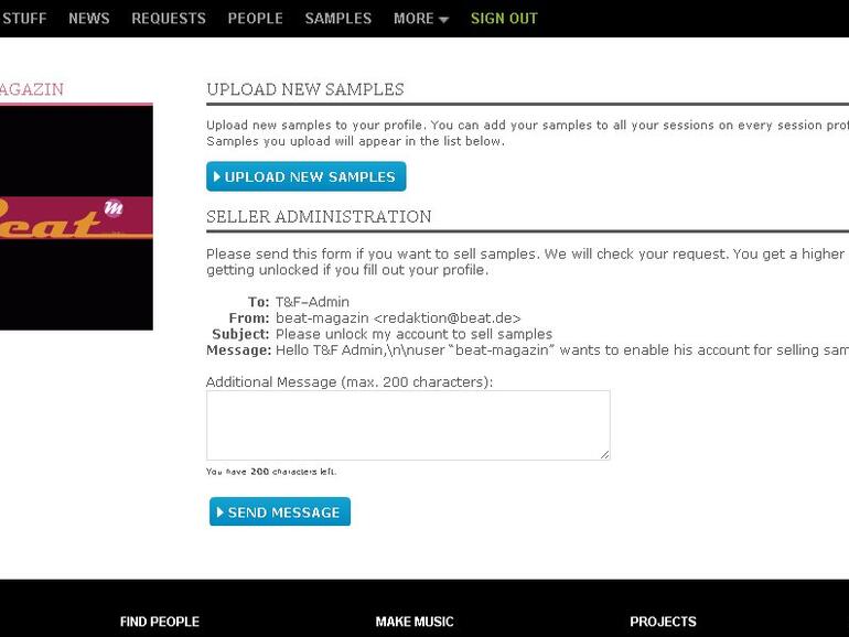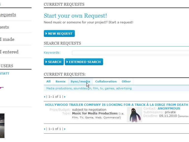 Die Konditionen für den Verkauf von Samples können Sie den AGBs des Sample-Shops entnehmen, die Ihnen bei Account-Freischaltung zugeschickt werden. Eine weitere interessante Funktion sind die Requests, die dem Benutzer die Möglichkeit geben, eigene Stücke als Hintergrundmusik für Werbung, Film und Games anzubieten oder an Remix-Wettbewerben teilzunehmen.