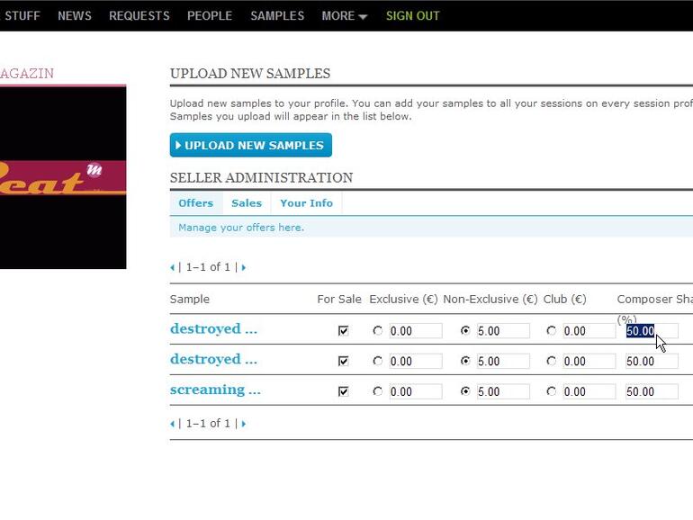 Auf der Sales-Seite können Sie den Preis Ihres Samples bestimmen. Diese Einstellungen lassen sich jederzeit ändern. Vergessen Sie nicht, auf der Seite Your Info das Paypal-Konto für Ihre Einnahmen eintragen. Ferner können Sie hier festlegen, ob Sie Mitglied einer Verwertungsgesellschaft sind sowie die Musterlizenzverträge für den Sample-Verkauf einsehen und beliebig ändern.