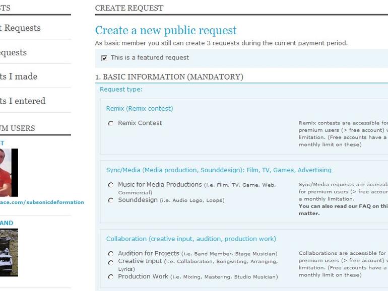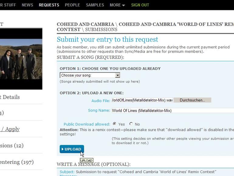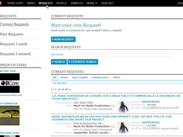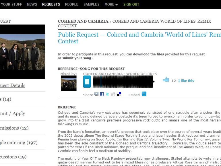 Auf der Requests-Seite können Sie anhand bestimmter Kriterien nach Anfragen suchen. Besonders spannend sind die Remix-Wettbewerbe bekannter DJs und Bands wie Hell, The Temper Trap und Coheed & Cambria, an denen auch freie Benutzer teilnehmen können. Klicken Sie eine aktuelle Remix-Anfrage an, um sich etwas umzusehen. Den Request Details können Sie Informationen zu den Wettbewerbsregeln entnehmen.