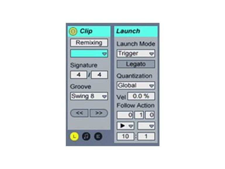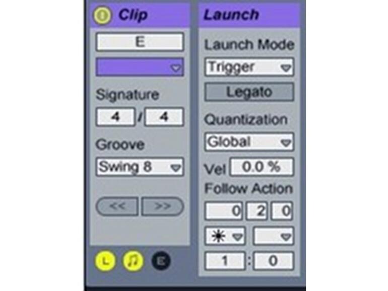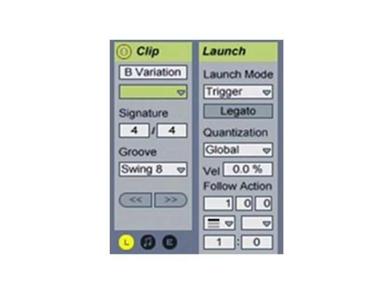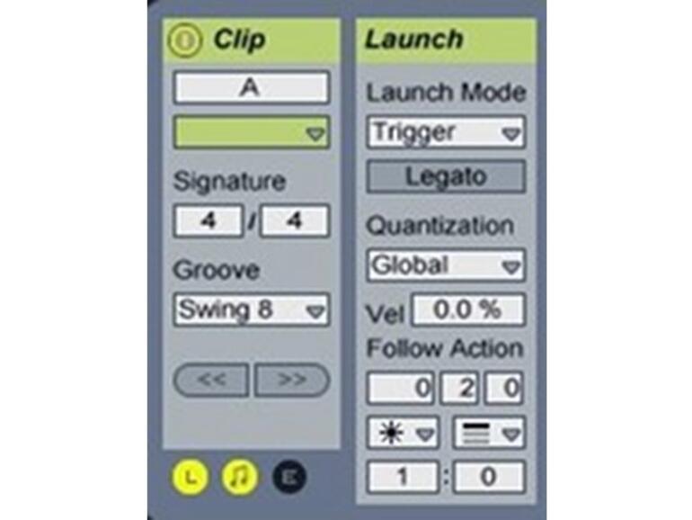 Nun blenden Sie bitte die Startparameter ein, indem sie mit dem Mauszeiger auf das kleine L-Symbol links unten klicken. In dem nun angezeigten Launch-Bereich kann man grundsätzlich das Einstartverhalten der Clips definieren. Im unteren Drittel des Rahmens befinden sich die Parameter für die zugehörigen Follow-Action-Funktion.