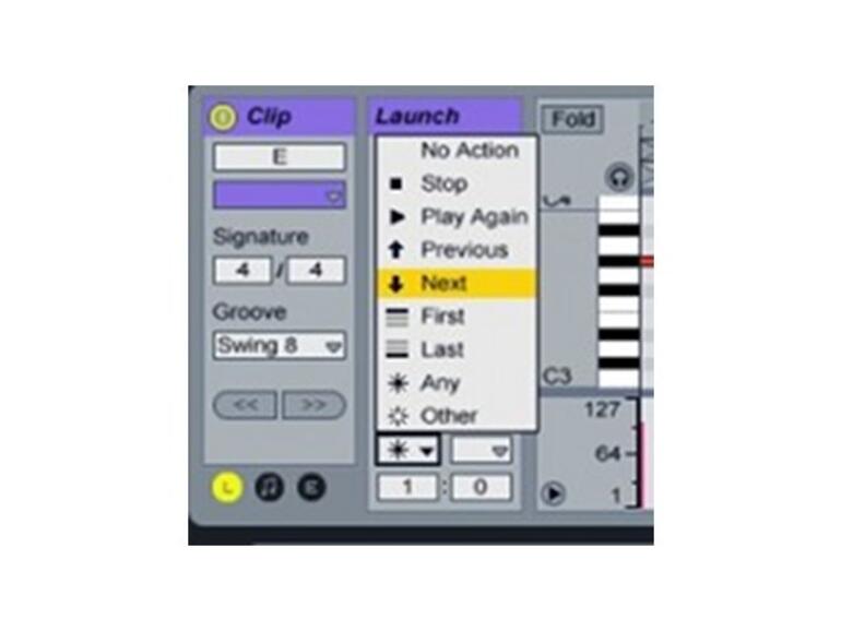 Grundsätzlich lassen sich zwei alternative Follow-Actions mit den Wahlmenüs definieren. Die Optionen sind vielfältig und laden zum nachhaltigen Ausprobieren ein. Solange keine Aktion ausgewählt ist, tritt keine Follow-Action ein. Wählen Sie daher nun bitte zunächst die Option Next und starten Sie dann den Clip. Achten Sie darauf, was nach zwei Beats passiert.