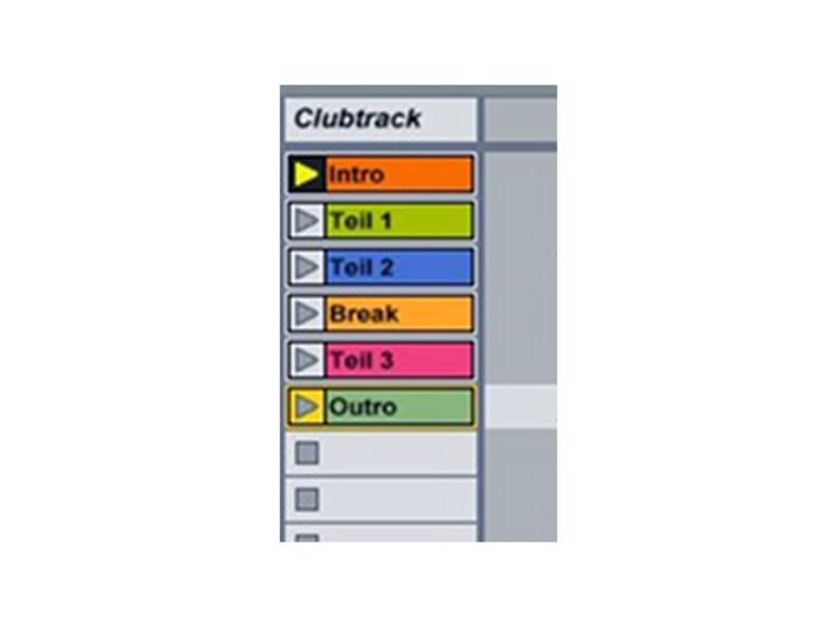 Zerteilen Sie einen Clubtrack in mehrere Clips, die jeweils Songteile repräsentieren. Die Follow-Action jedes Clips startet den nachfolgenden Clip mit der passenden entsprechenden Zeit, weshalb der Song zunächst linear abläuft. Durch das manuelle Unterbrechen einer Follow-Action kann man einzelne Songteile im Loop laufen lassen und somit deren Linearität aufbrechen.