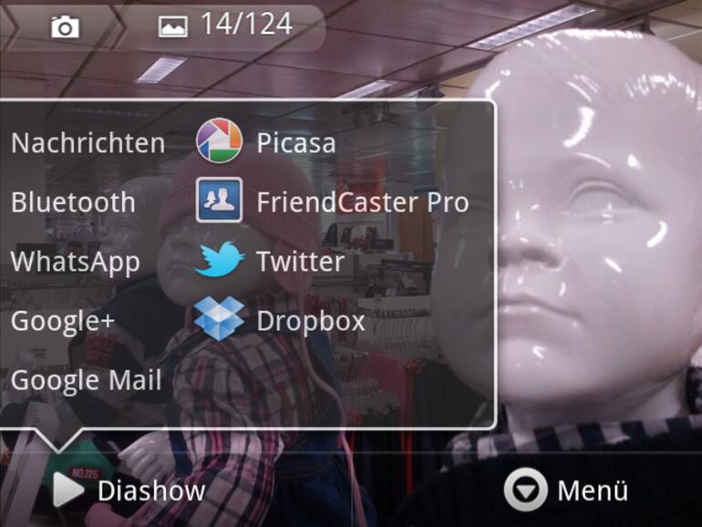 "Angenommen, man hat ein Bild mit der Gerätekamera seines Android-Handys geschossen und will dieses an Freunde weiterverteilen. In der Android-Galerie tappt man dazu auf das Foto, dann die Menütaste und schließlich auf „Freigeben“. Nun taucht eine Liste der Apps auf, mit denen man das Bild hochladen oder anderweitig weiterverteilen kann. Der Clou ist, dass sich jede App, sofern sie entsprechend programmiert ist, in dieses Menü „einhängen“ kann."