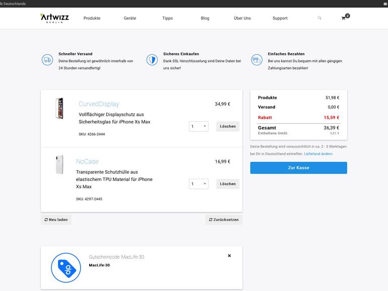 Die 30 Prozent Rabatt können Sie ganz einfach einheimsen: Packen Sie Ihre Produkte in den Warenkorb und geben Sie beim Bezahlen an der Kasse im Feld Gutschein-Code den Code MacLife-30 ein. Ein Klick auf das +-Zeichen daneben und schon werden Ihnen die besagten 30 Prozent von der Endsumme abgezogen. Ein Limit, wie viele Produkte Sie erwerben dürfen, gibt es nicht. Der Gutschein ist pro Account nur einmal einlösbar. Torschluss ist am Sonntag um 24 Uhr.