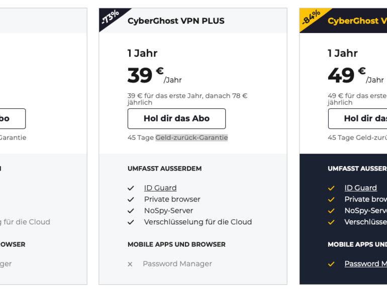 CyberGhost bietet dir dafür Tools für Browser wie Google Chrome und Firefox, aber auch Apps für iOS, macOS, Windows, Linux, Konsolen und Smart-TVs - und ist damit ein echter Allrounder. Den regulären Preis von rund 12 Euro im Monat kannst du dabei mit einem Jahres-Abo drücken. Das Abo gibt es dazu jetzt mit rund 73 Prozent Rabatt für 39 Euro im ersten Jahr. Im zweiten Jahr steigt der Preis auf 78 Euro.