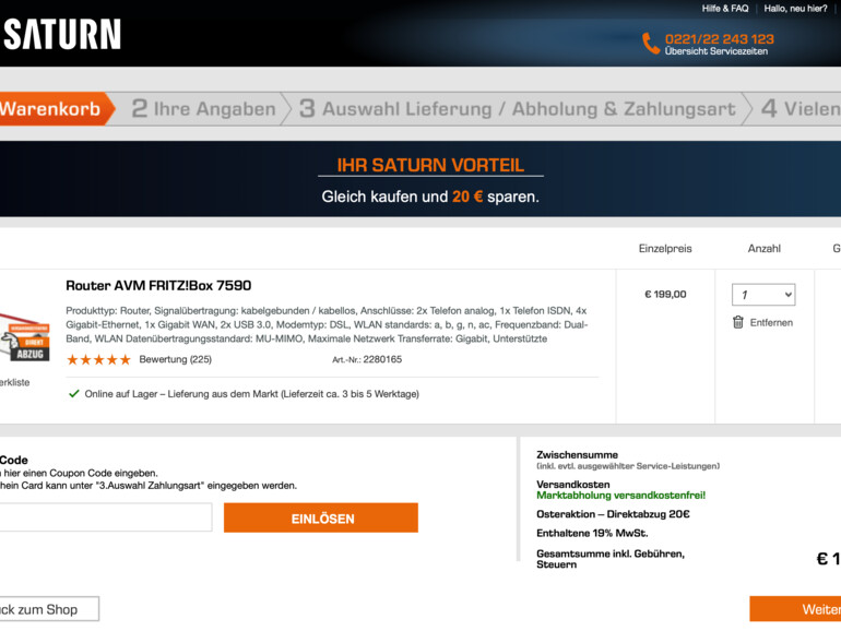 Bei Saturn könnt ihr euch derzeit noch einmal 20 Euro Direktabzug Oster-Rabatt für die Fritzbox 7590 sichern. Der Router des Berliner Herstellers AVM kostet im Saturn-Online-Store derzeit schon ohne den Zusatz-Rabatt nur 199 Euro statt 249 Euro unverbindliche Preisempfehlung. Wichtig: Der Direktabzug des Oster-Rabatts in Höhe von 20 Euro seht ihr erst, wenn ihr den Router im Warenkorb habt.