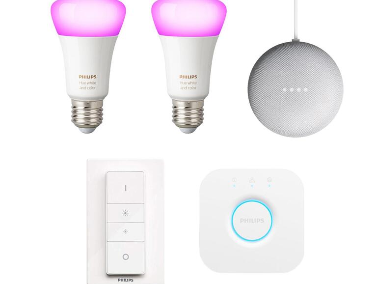 - Mit zwei Philips Hue White & Color Ambiance E27-Lampen, Bridge, Dimmschalter und einem Google Nest Mini Lautsprecher.