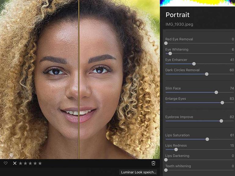 » Porträtoptimierung per Schieberegler: Augen, Haut und Proportionen anpassen.