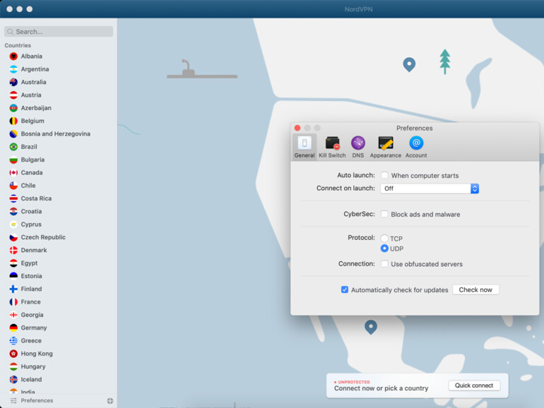 Neben dem offensichtlichen und zuvorderst stehenden Schutz deiner Daten und Internet-Aktivitäten, bietet NordVPN noch ein paar Zusatz-Funktionen, die eher im Hintergrund laufen, die in deinem Online-Alltag aber wichtig werden können. Unter anderem bist du mit einer Lizenz mit zweifacher Verschlüsselung, dem sogenannten Double VPN vor Trackern und Cybergefahren geschützt. Ebenso wenig sichtbar, aber im Angebot implementiert, ist Onion Over VPN, eine Funktion, die dich nachhaltig und mit neuesten technischen Systemen vor Drittparteien absichert und dich anonym surfen lässt. Sollte die Verbindung zum VPN-Server einmal aus Versehen abbrechen, verhindert übrigens ein Kill Switch, dass dein Gerät auf das Internet zugreift. Selbst eine versehentliche Enthüllung deiner Daten wird somit verhindert.