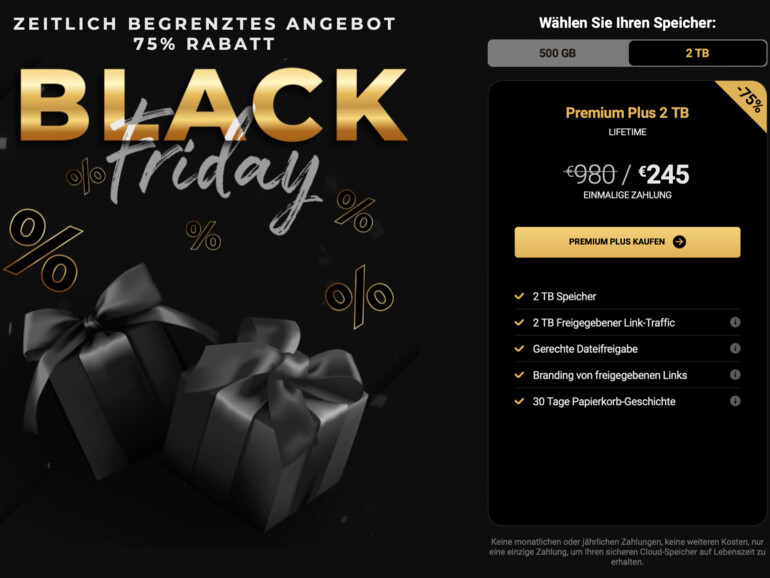 Den oben erwähnten Lifetime-Plan für 2 TB Cloud-Speicher bekommst du momentan satte 75% günstiger. Das heißt, du zahlst statt 980 Euro nur 245 Euro und bekommst ein Leben lang deinen sicheren Speicherplatz mit allen flexiblen Möglichkeiten. Aber Achtung: Das Angebot endet nach dem Black-Friday-Wochenende! Möchtest du dir diesen einmaligen Deal sichern, brauchst du nur hier auf den Link zu klicken und zuzuschlagen.
