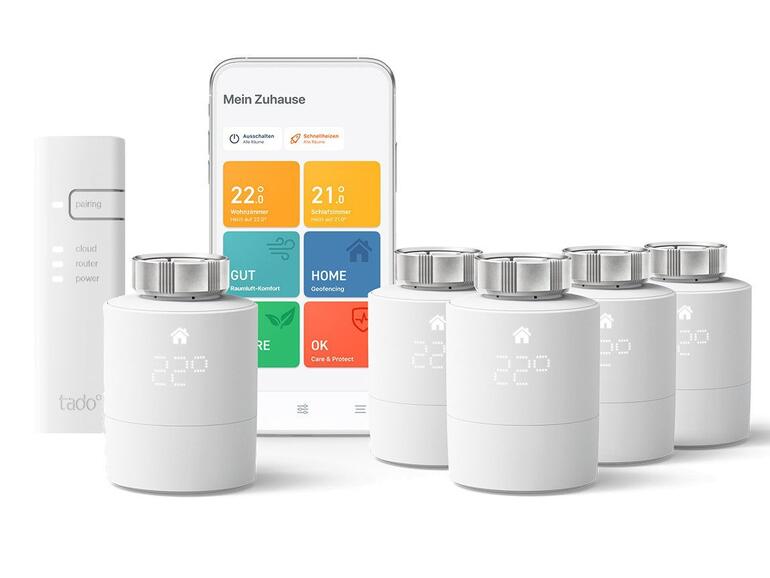 Das smarte Heizkörper-Thermostat Starter Kit V3+ von tado mit fünf Thermostaten und einer Bridge zur Einzelraumsteuerung erhältst du über Tink derzeit bereits für 399 Euro (statt 470 Euro). Das Angenehme an dem System sind nicht nur das minimalistische Design und die Steuerung, die einfacher nicht sein könnte, sondern auch die diversen zusätzlichen Fähigkeiten. Du kannst selbst von unterwegs festlegen, welche Räume beheizt werden, das tado-Kit ist aber auch intelligent genug, selbst zu erkennen, wann die Heizung wie gesteuert werden muss und wie für ein gesundes und komfortables Raumklima gesorgt wird.