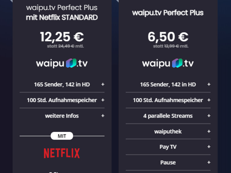 - Waipu.tv Perfect Plus mit Netflix Standard-Abo jetzt für 12,25 Euro/Monat