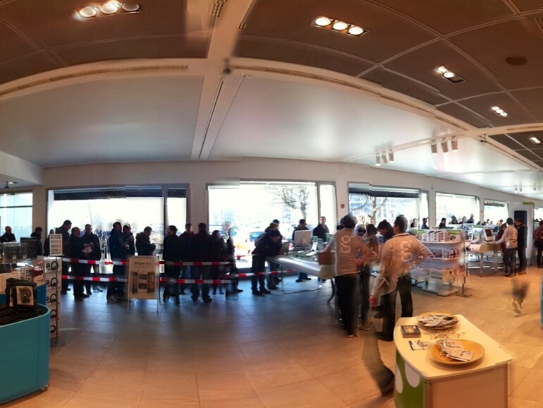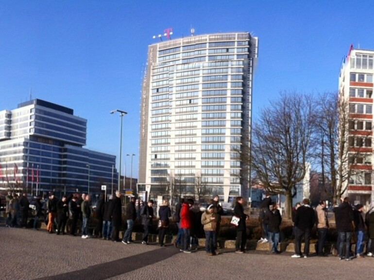 (Bild: Tobias Friedrich) Die Schlange vor der Gravis Filiale am Berliner Ernst-Reuter-Platz reichte bis zur Ampel.