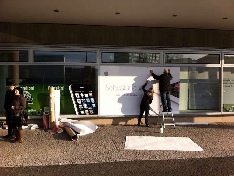 (Bild: Tobias Friedrich) Während die Kunden anstanden, wurde die Werbung für das neue iPad am Schaufenster angebracht.