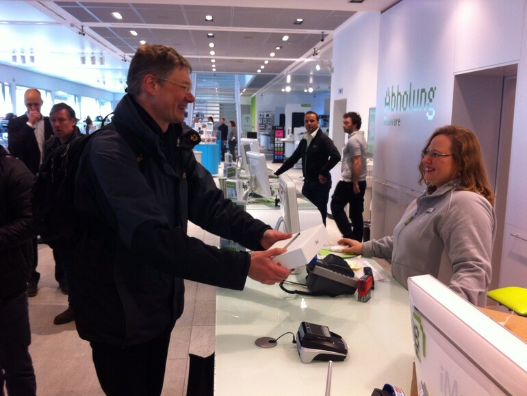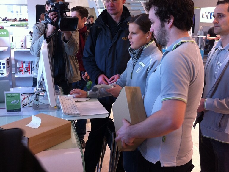 (Bild: Tobias Friedrich) Feierlich bezahlt der erste Kunde sein neues iPad und muss es den Journalisten und Fotografen präsentieren.