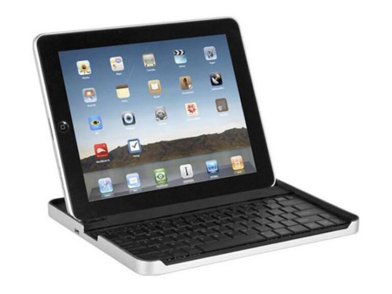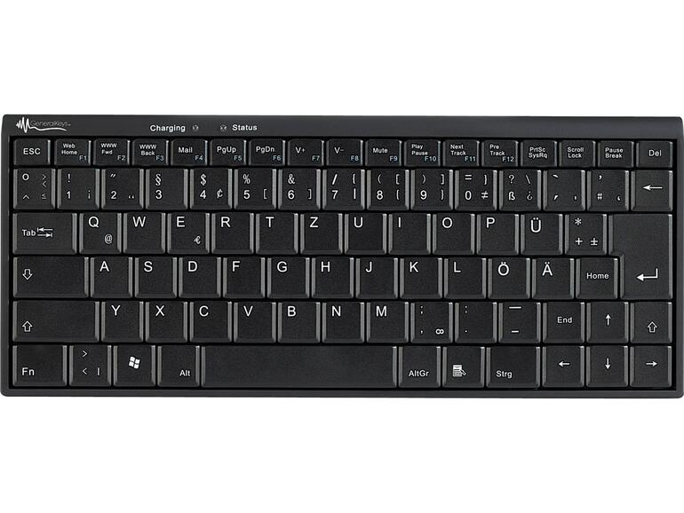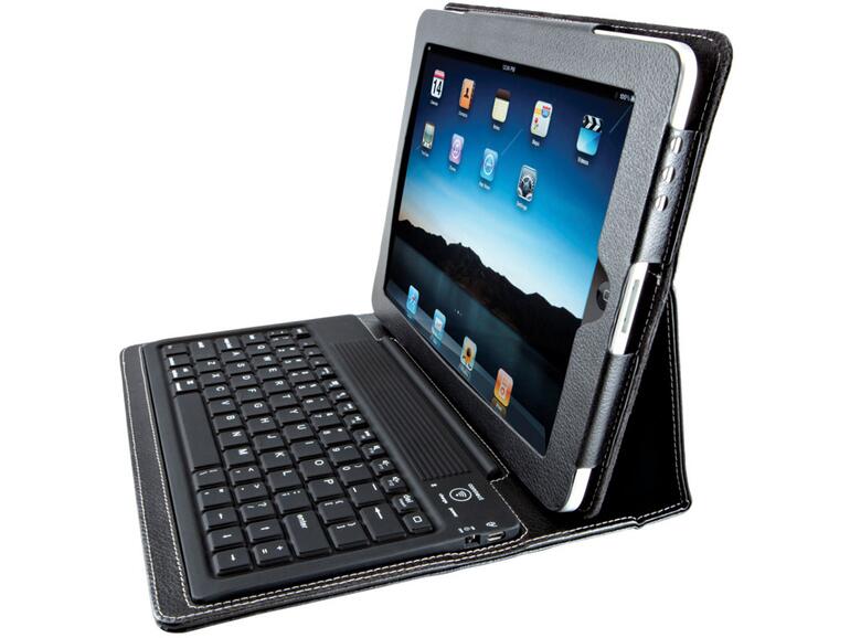 Die bei Pearl erhältliche Bluetooth-Mini-Tastatur von GeneralKeys stellt eine Alternative zum Apple-Keyboard dar. Die Pearl-Tastatur ist aus Kunststoff gefertigt. Sie ist genauso breit wie das iPad im Querformat und trägt im Handgepäck nicht so dick auf. Dafür sind die Tasten etwas schmaler, vermitteln aber dennoch ein sicheres Schreibgefühl für Vielschreiber. Als Besonderheit verfügt die Tastatur über einen integrierten Akku, der mit einem zugehörigen USB-Kabel zum Beispiel auch mit dem Netzteil vom iPad aufgeladen werden kann. Einmal mit dem iPad gekoppelt, stellt die GeneralKeys zuverlässig die Verbindung her. An der Unterseite befindet sich ein Schiebeschalter, mit der die Bluetooth-Mini-Tastatur zum Transport ausgeschaltet wird.