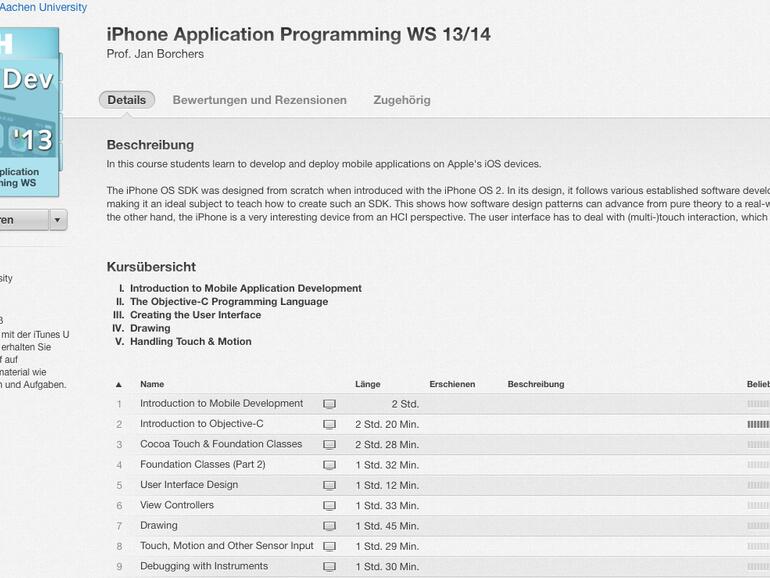 Publizierte Kurse wie „iPhone Application Programming WS 13/14“ der RWTH Aachen und „Erdkunde Klasse 10“ des Bergischen Internats können bekannterweise auf dem Mac in iTunes und unter iOS mit der kostenlosen App „iTunes U“ abgerufen werden.