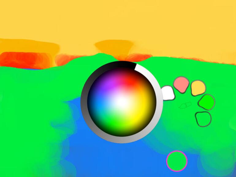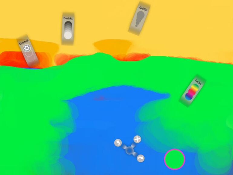 Was damit gemeint ist, zeigt Adobe in einem kurzen Einführungsvideo beim erstmaligen Start der App. So verwischen, verlaufen und verschwimmen Farben beim Auftragen – teilweise bevor die endgültige Form und Farbe erreicht wird. Andere Werkzeuge bietet Eazel nicht, lediglich Farbe, Deckkraft und Größe können eingestellt werden.