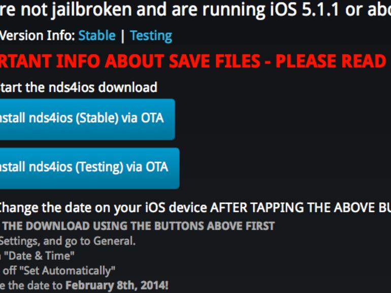 NDS4iOS ist als Over-the-Air-Update hier auf Geräten mit iOS 5.1.1 oder neuer zu laden. Unterschieden werden die zwei gereichten Versionen nach „stabil“ und „im Test“. In jedem Fall gilt die Anweisung, auf dem betreffenden iPhone, iPad oder iPod Touch das Datum auf den 8. Februar 2014 zurückzusetzen und die automatische Zeiteinstellung zu deaktivieren.