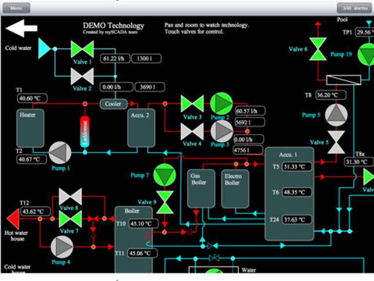 Nur falls es wen interessiert - die App "mySCADA" dient zur Darstellung von automatisierten Systemen über WWW und das iPad. So kann ich von zu Hause schon sehen, wo das Problem liegt und ob meine Anwesenheit im Betrieb erforderlich ist oder meinen Mitarbeitern Tipps zur Fehlerbehebung geben. Früher musste ich bei jedem Alarm (per SMS) ins Werk fahren. SCADA bedeutet übrigens "Supervisory Control And Data Aquisition"