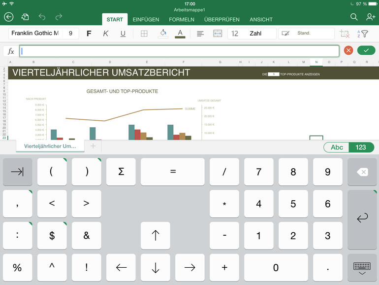 Bei der Eingabe von Zahlen hilft Microsoft mit einem eigenen Tastatur. Am Bildschirm bietet die Zahlen-Tastatur innerhalb der Excel-App Sondertasten zur Steuerung der Einfügemarke und einen Zahlenblock mit großer Eingabetaste, wie man es am Computer von erweiterten Tastaturen gewohnt ist. Sollte man eine Bluetooth-Tastatur nutzen, so kann die Excel-eigene Bildschirmtastatur trotzdem eingeblendet werden.