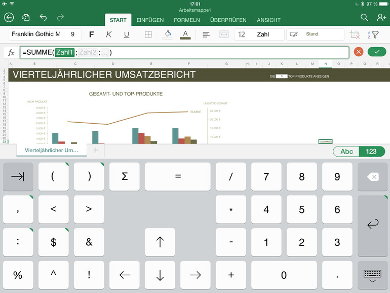 Auf dem iPhone kann Microsoft Office keine neuen Spalten in Rechenblätter einfügen und ist gerade einmal zum Vorzeigen geeignet. Auf dem iPad hingegen bringt Excel für iPad bei ausgewählten Zeilen oder Spalten die nötigen Befehle zum Einfügen von zusätzlichen Zeilen und Spalten im iOS-Kontextmenü. Besonders gut umgesetzt ist das Eingabefeld, mit dem auch Formeln in Tabellenzellen eingegeben werden. Über die Schaltfläche „fx“ sind Formeln schnell erstellt. Wie am Desktop hält Excel zuletzt verwendete Funktionen in einer Auswahlliste. „Mittelwert“, weitere Statistik-Funktionen und Datumsfunktionen stehen zur Verfügung. Für die gebräuchliche „Summe“ gibt es eine Taste, die am Zeichen „∑“ zu erkennen ist.