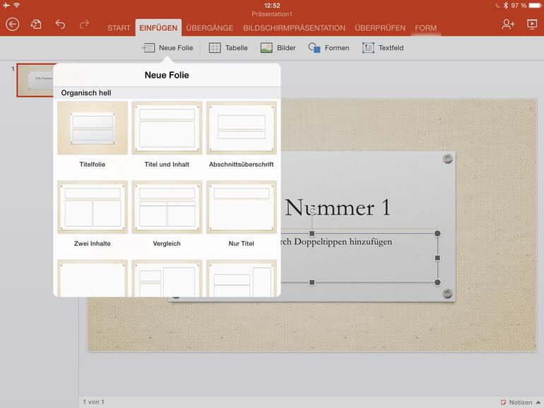 Etwa 215 Megabyte belegt PowerPoint auf dem iPad. Enthalten sind 20 Vorlagen inklusive in der App benötigter Schriften. Vorlagen für Präsentationen beinhalten jeweils weitere Vorlagen für die einzelnen Blätter der Präsentation. Diese Folien bieten wiederum Vorlagen mit vielfältigen Layout-Alternativen. Eigene Vorlagen lassen sich nicht anlegen. Daher finden Sie schnell eine Vorlage, deren optische Erscheinung am besten zu Ihren Anliegen und Aussagen passt. Unter der Schaltfläche „Start“ lassen sich weitere Folien auswählen und in die Präsentation einbauen.