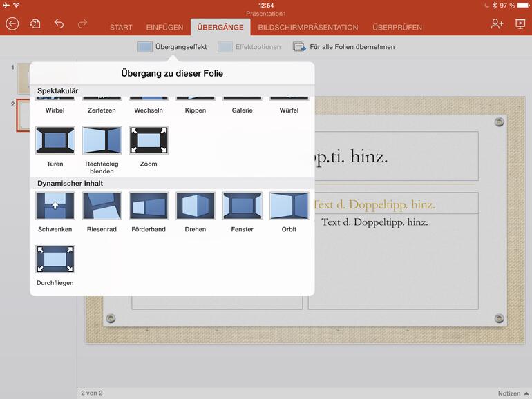 Gut gelöst ist die Anwendung von Überblend-Effekten auf alle Folien einer Präsentation, denn nichts verwirrt Zuhörer mehr, als zu jeder neuen Folie ein neuer Überblendeffekt.