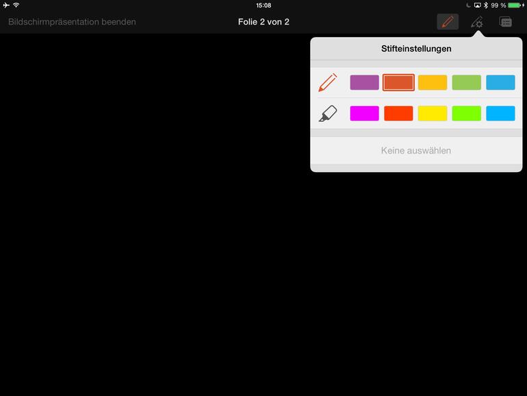 Die Möglichkeiten, auf präsentierten Folien zu zeichnen und per Fingerdruck einen Laserpointer einzublenden, sind besonders praktisch, wenn der Vortrag über iOS-7-AirPlay auf einem großen Bildschirm ausgegeben wird. Denn den virtuellen Laserpointer kann man nicht vergessen. Doch Keynote zeigt im Präsentationsmodus auf dem iPad und für Zuschauer nicht sichtbar eine Uhr und - sofern vorhanden – Notizen zu den jeweiligen Folien an.