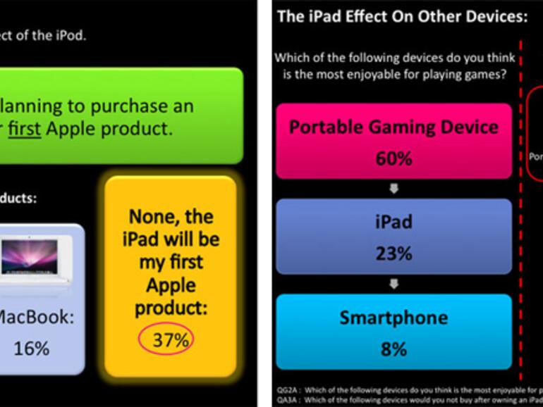 28 % der von den Marktforschern befragten Kunden gaben an, das iPad hauptsächlich zum Spielen zu verwenden. Rund 38 % wollen sich nach dem iPad jedoch keine zusätzliche mobile Spielekonsole zulegen. Auch für die eBook-Reader, wie beispielsweise Amazons Kindle, bedeutet das iPad eine große Konkurrenz. Gerade deshalb senkte das Versandhaus kürzlich den Preis seines Gerätes. Sehr interessant ist auch die Tatsache, dass 37 % das iPad-Nutzer Neukunden sind und noch nie ein Apple-Produkt ihr Eigen nennen konnten.