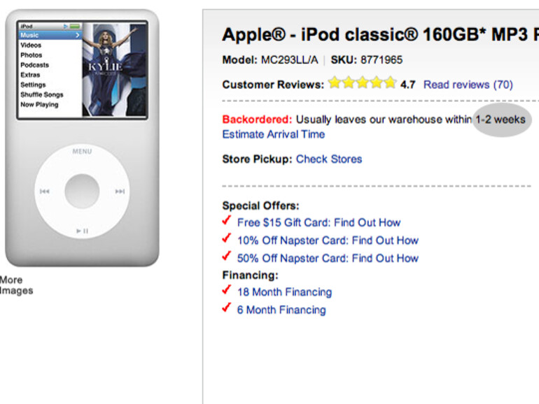 Einige News-Seiten berichteten von verlängerten Lieferfristen im amerikanischen Apple Store, aber momentan werden dort als Lieferfrist wieder maximal 24 Stunden angegeben. Anders sieht es beim Online-Händler Best Buy aus, wo man auf das silberne Modell ein bis zwei Wochen warten muss. Bei J & R sind das schwarze und das silberne Modell überhaupt nicht mehr lieferbar. Bei amazon.com liegt die Zahl der lieferbaren classics im niedrigen einstelligen Bereich, bei amazon.de ist die Zahl zweistellig.