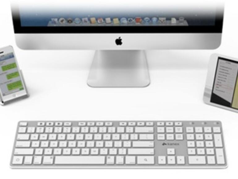 Kanex Multi-Sync Keyboard schafft die Bedienung via Bluetooth mit Smartphones, Tablets, Laptops und Desktop-Rechnern. Bis zu drei Geräte können gleichzeitig mit der Tastatur gekoppelt werden, die auf den ersten Blick sehr stark an Apples Keyboard erinnert: Weiße Tasten mit Aluträger im Standard-Format, also inklusive Sondertasten und Zahlenblock. Es gibt auch eine Reihe Mac- und iOS-spezifische Sondertasten.