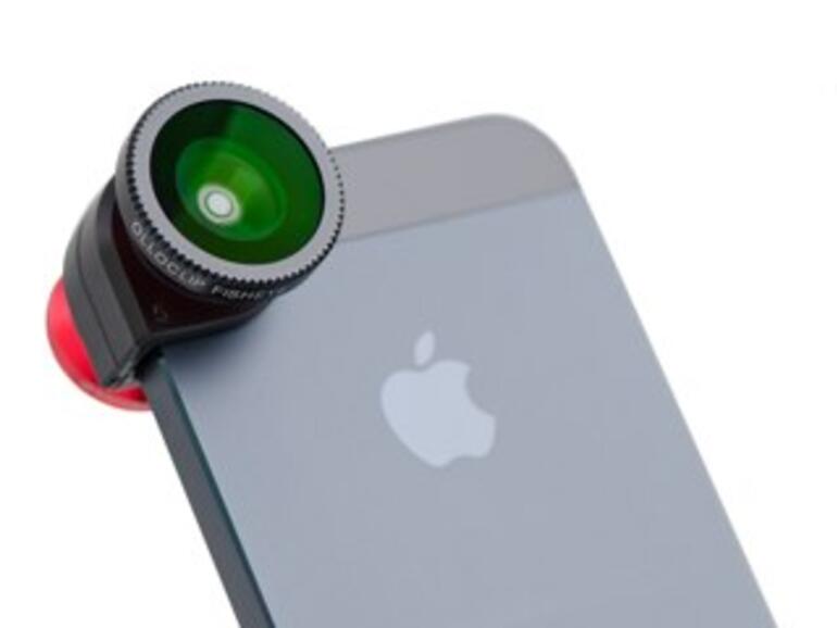 Olloclip ist ein 3-in-1-Objektiv für das Apple iPhone 5. Der Aufsatz bietet drei Objektive. Dabei handelt es sich um ein Fischaugen-Objektiv auf der einen Seite und ein Weitwinkelobjektiv auf der anderen Seite. Das Weitwinkelobjektiv kann abgeschraubt werden. Dann verfügt man zusätzlich über ein Objektiv für Makro-Aufnahmen. Olloclip ist kompatibel mit iPhone 5 ohne Bumper und Hülle. Der Olloclip wird einfach über die rechte Kante des iPhone 5 gestülpt, so dass die iPhone-Kamera durch die Extra-Linsen hindurch fotografiert.