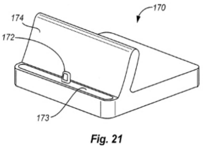 Um letzteres Ziel zu erreichen, enthält der Lightning-Anschluss kleine Kerben, die wiederum von flexiblen Halterungen innerhalb des Anschlusses festgehalten werden. Allerdings war auch die Ausrichtung für Apple ein wichtiger Faktor. Interessanterweise enthält der Patent-Antrag auch Bilder eines Lightning-Docks. Bisher bietet Apple ein solches Zubehör für das iPhone 5 noch nicht an.