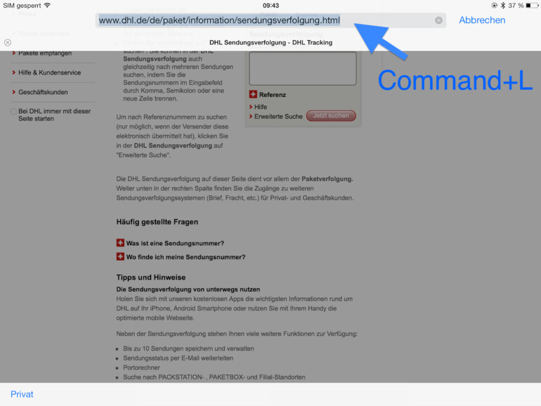 Beendet das Laden einer Website. Command+. ist besonders praktisch, wenn man mit dem iPad unterwegs eine langsame Internetverbindung erwischt hat und sich das Öffnen einer Seite schier endlos hinzieht. Mit dem Befehl stoppt man den Ladeversuch.